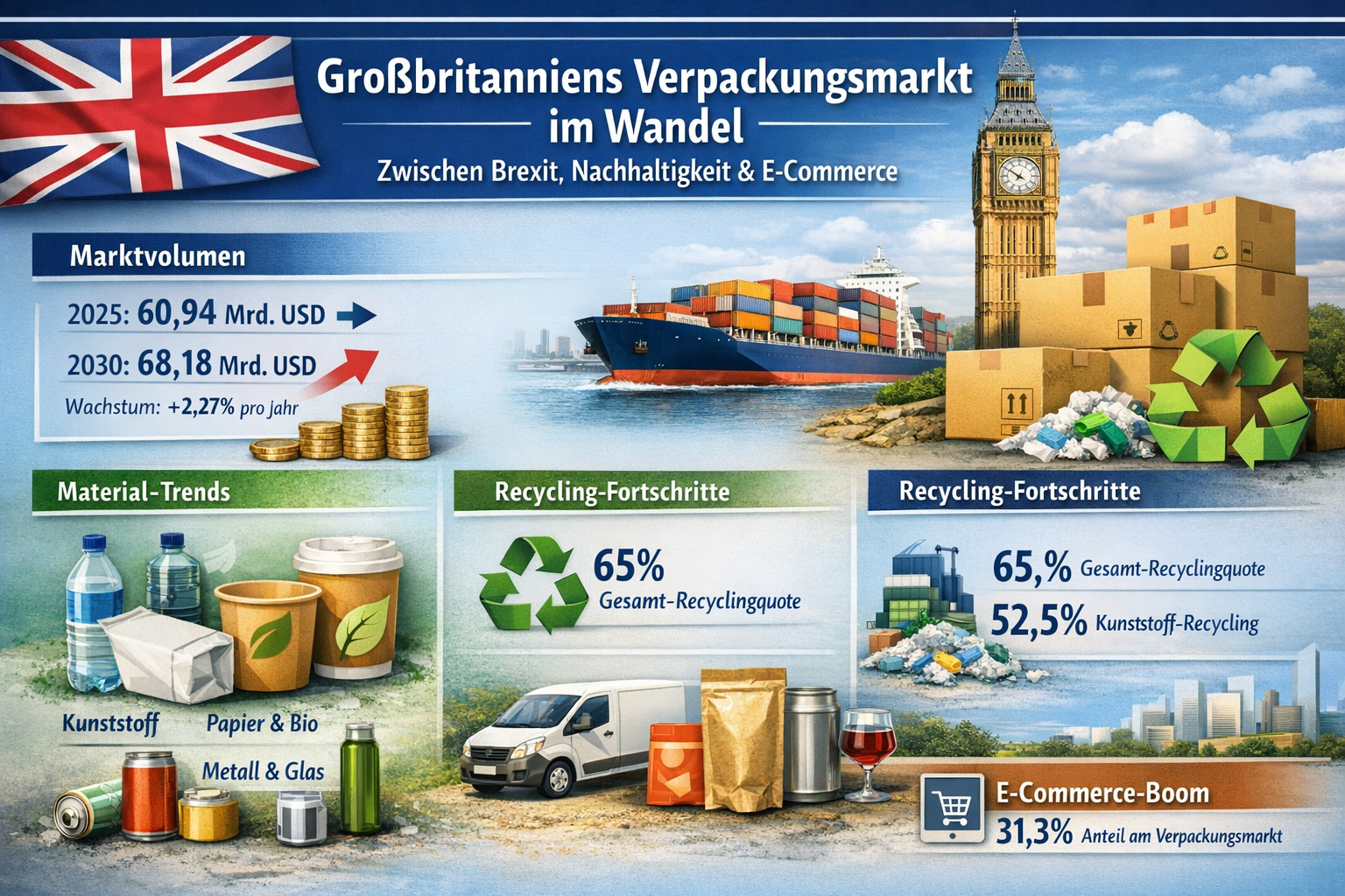 Analysen von Mordor Intelligence zeigen, dass der britische Verpackungsmarkt 2025 ein Volumen von 60,94 Milliarden US-Dollar erreicht hat und bis 2030 auf 68,18 Milliarden US-Dollar anwachsen dürfte. Dies entspricht einer durchschnittlichen jährlichen Wachstumsrate von 2,27 Prozent. Treiber dieses Wachstums sind vor allem die anhaltende Dynamik des E-Commerce, technologische Innovationen im Recyclingbereich sowie strukturelle Veränderungen entlang der Wertschöpfungskette. Geografisch konzentriert sich der Markt stark auf England, das rund 84 Prozent der Nachfrage auf sich vereint, was sowohl auf die Bevölkerungsdichte als auch auf die industrielle Infrastruktur zurückzuführen ist.
