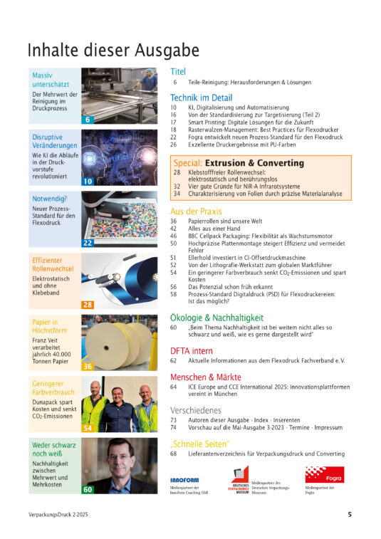 Massiv unterschätzt: Der Mehrwert der Reinigung im Druckprozess +++ Disruptive Veränderungen: Wie KI die Abläufe in der Druckvorstufe revolutioniert +++ Notwendig? Neuer Prozess-Standard für den Flexodruck +++ Effizienter Rollenwechsel: Elektrostatisch und ohne Klebeband +++ Papier in Höchstform: Franz Veit verarbeitet jährlich 40.000 Tonnen Papier +++ Geringerer Farbverbrauch: Dunapack spart Kosten und senkt CO2-missionen