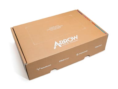 Im Wellpappendirektdruck auf Recyclingmaterial testweise produzierte Musterverpackung der Weilburger Graphics GmbH mit dem neuen Deckweiß.