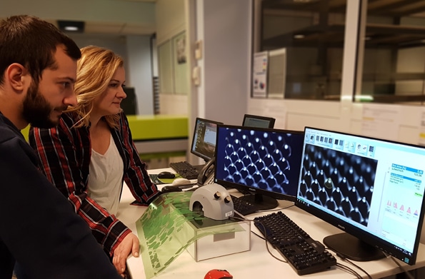 Aimilia Ventouri, Flexo Prepress Supervisor bei A. Hatzopoulos S.A. (2. v. l.), mit einem Kollegen bei der Analyse einer Flexodruckplatte mit dem Messgerät Sibress FlexoControl 3D Plus (Quelle: Sibress)